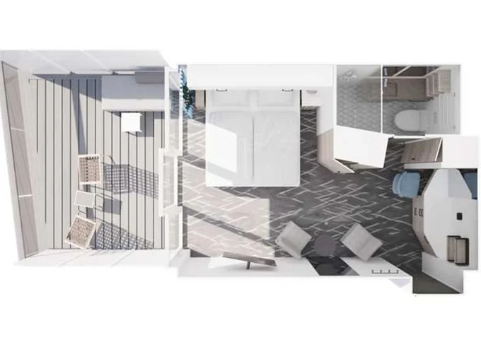 | VEKO - Kajuta s terasou 20 m² + balkón 13 m² so stoličkami a váľandou. 15. paluba. Max 2 osoby. | 6 612 € 6 612 € za osobu | ||