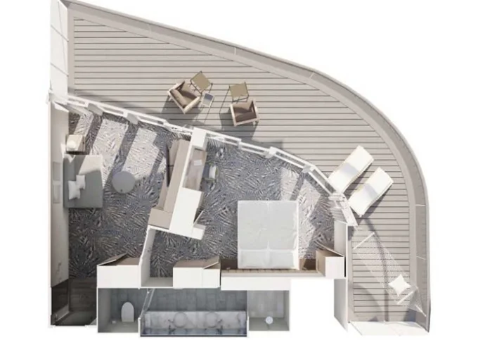 | SUGO - Große Freiheit Suite 88 m² + balkón 43 m² so stolom, ležadlami + balkón s hojdacou sieťou. 2 spálne, 2 kúpeľne, šatník, infračervená sauna. 9,10. paluba. Max 6 osoby. Výhody Suite. | 31 798 € 15 899 € za osobu | ||