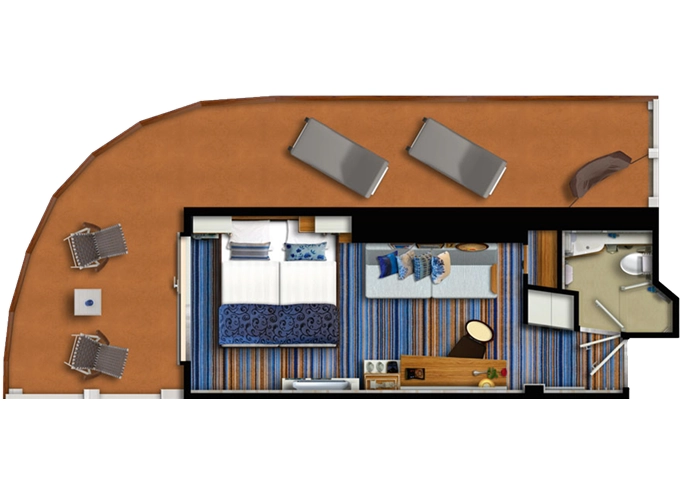 VEPO - Kajuta s terasou Premium 17 m² + balkón 30 m² so stolom, 2 ležadlami a hojdacou sieťou. 11. paluba. Max 3 osoby. 2 382 € 2 382 € za osobu